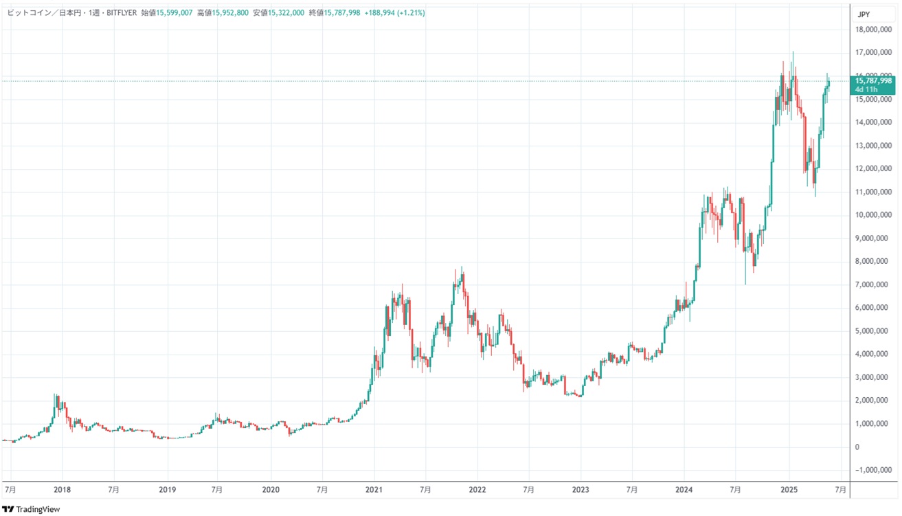 ビットコインの年単位のチャートを見てもらえばわかるように振り幅が大きいです。