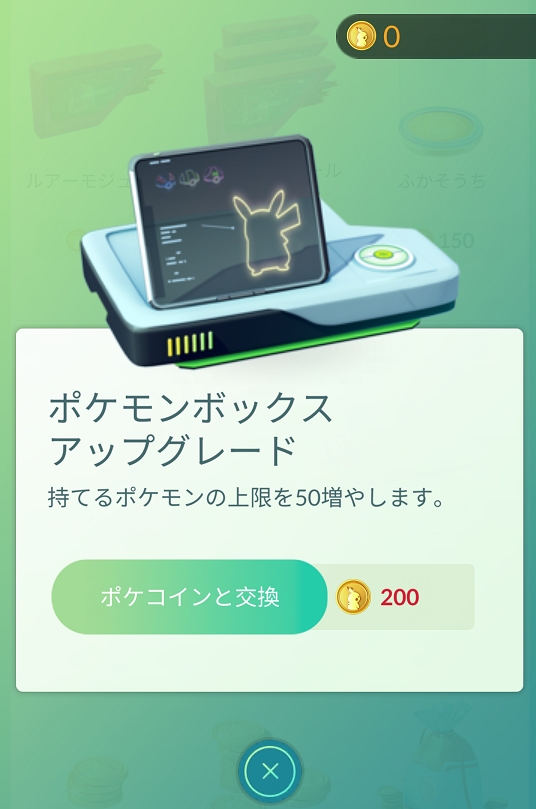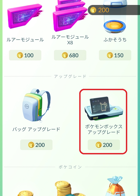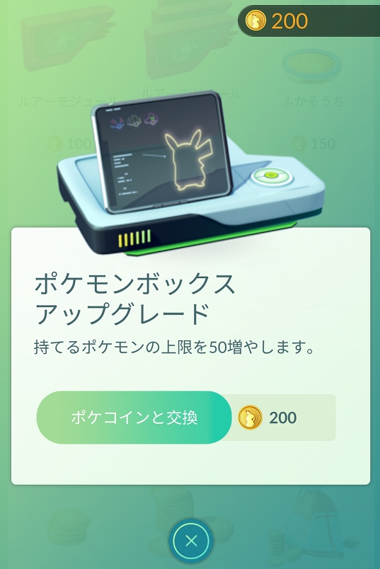 1回のポケモンボックス アップグレードにつきポケコイン200が必要で、 1回のポケモンボックス アップグレードにつき50所持数が増えます。