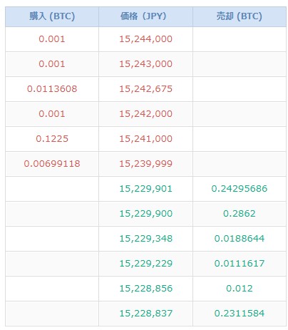 以下は大手のビットフライヤーのビットコイン(BTC)の売り買いの板です