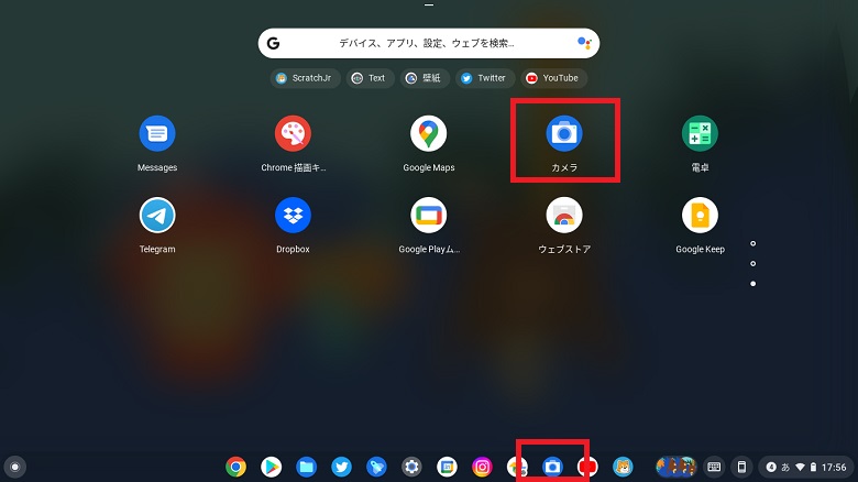 カメラ機能は「カメラランチャー」より起動します、又カメラ機能の使用頻度が多い場合はシェルフに固定しておきましょう。