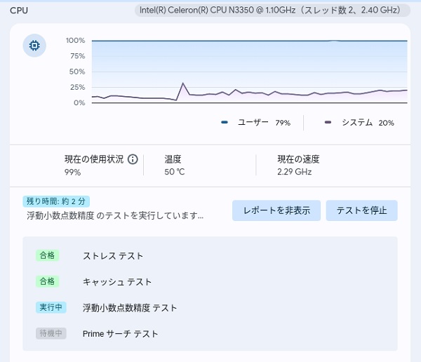 約5分ほどでCPUのテストが終了し、結果が表示されました。