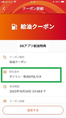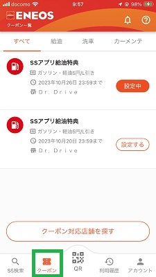 クーポンを選択して設定します、クーポン割引を適用するためにはENEOS SSアプリを実際に使用する前に設定しておく事になります。