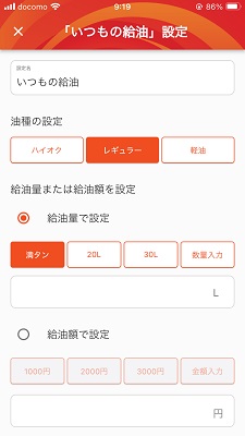 ・「いつもの給油」を設定