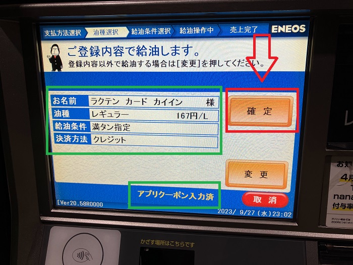 以上で大丈夫なら「確定」をタッチして、あとはいつも通り給油を行いましょう。