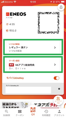 ENEOS SSアプリを使用する前にまずは「いつもの給油」及び「クーポン設定」がセットされている事を確認しましょう。