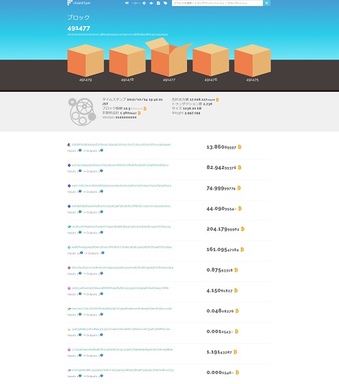 ブロック491477に格納されているビットコインの送受信がズラリと見れます。