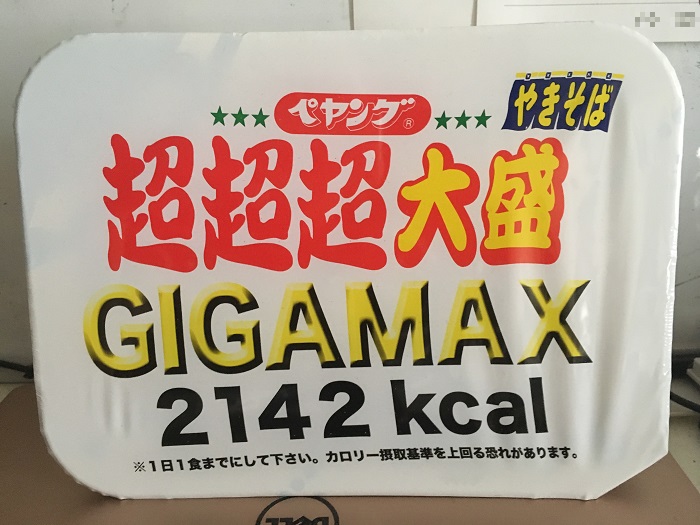 大人の1日の必要な摂取カロリーは1,800~2,200kcalと言われてますから、この「ペヤング超超超大盛GIGAMAX」だけで1日分をカバーしてしまいます。