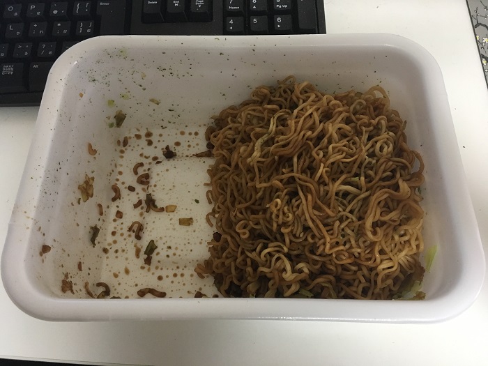 残り2/3のペヤングをどうするか考えます、一度では無理だったの一旦冷蔵庫に保存しました。