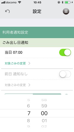 前日通知の有無、それからゴミ出し通知の時間を設定することが出来ます。