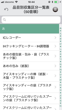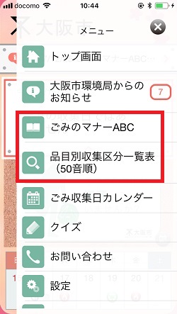 メニュー画面の「ごみのマナーABC」、「品目別収集区分一覧表」からゴミの出し方、ゴミの分別の種類などが確認できます(自治体により表記が違います)