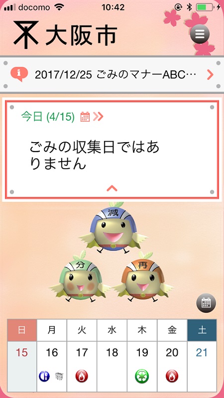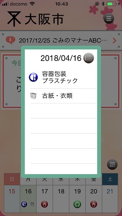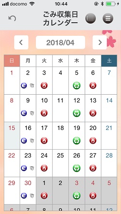 月単位のゴミ出しカレンダーが表示されます、またそれぞれのマークをタップすると