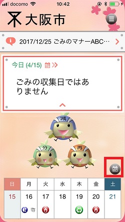 トップ画面に直近1週間のゴミ出しカレンダーが付いてます、それから赤枠で囲った「カレンダーマーク」をタップすると