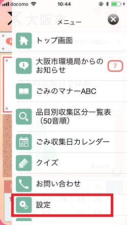 メニュー画面になります、「設定」をタップすると