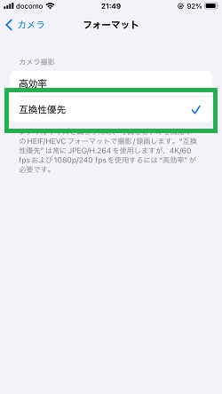 「互換性優先」をタップします。以上で以降の撮影する写真はJPEG形式になります。