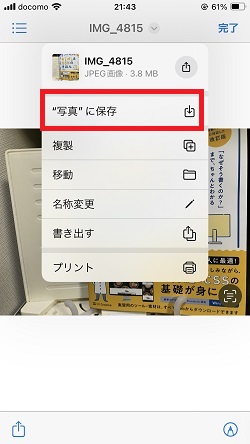「写真に保存」をタップするとJPEGで写真アプリの方にも保存されます。