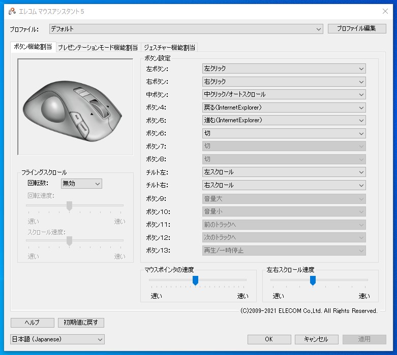 個人的には特に変更せずに使用しています、普通に使用する分には左クリック、右クリック、スクロール、トラックボールで充分だと思います。