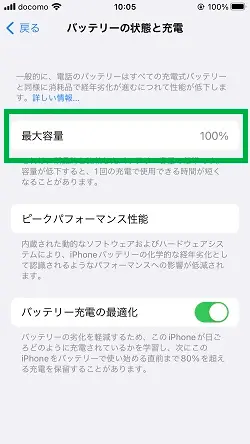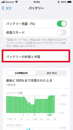 iPhoneのバッテリーの状態は「バッテリーの状態と充電」で確認する事が出来ます。
