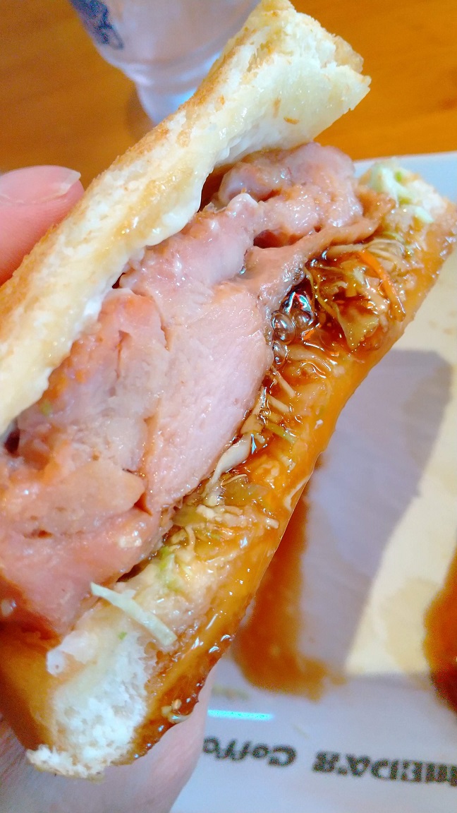 柔らかい照り焼きチキンに濃厚なソースとシャキシャキのキャベツをパンに挟んでいます。