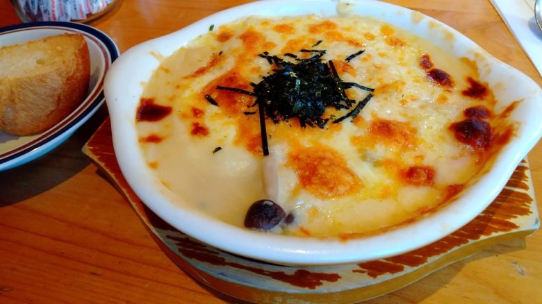 刻みノリが載って、こんがり焼き目がついたグラタンは、ホワイトソースに海老とマカロニが入ってます。