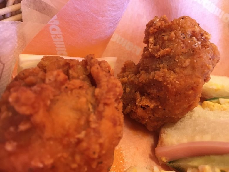 ミニコメバスケットは人気のコメチキ2個とサンドイッチの組み合わせになります。