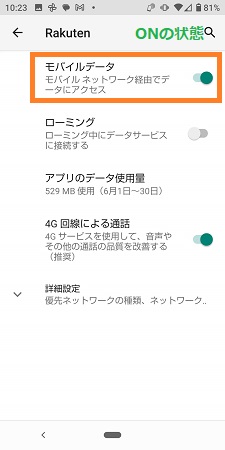 「モバイルデータ」のON・OFFを切り替えます。