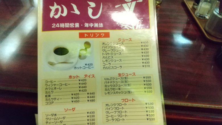 チェーン店のファミレスに比べれば若干割高かもしれませんが、個人店で24時間営業ですし