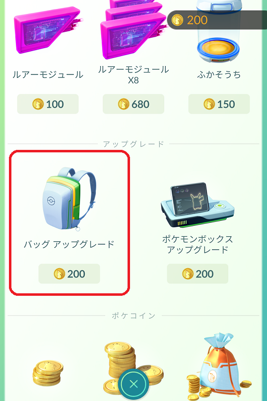 ポケコインを購入してバッグアップグレードする場合