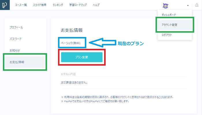 「アカウント設定」「お支払い情報」に進みます、ここでは現在のプランも確認することが出来ます。