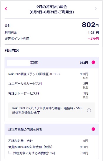 参考 楽天モバイルの実際の料金支払い明細
