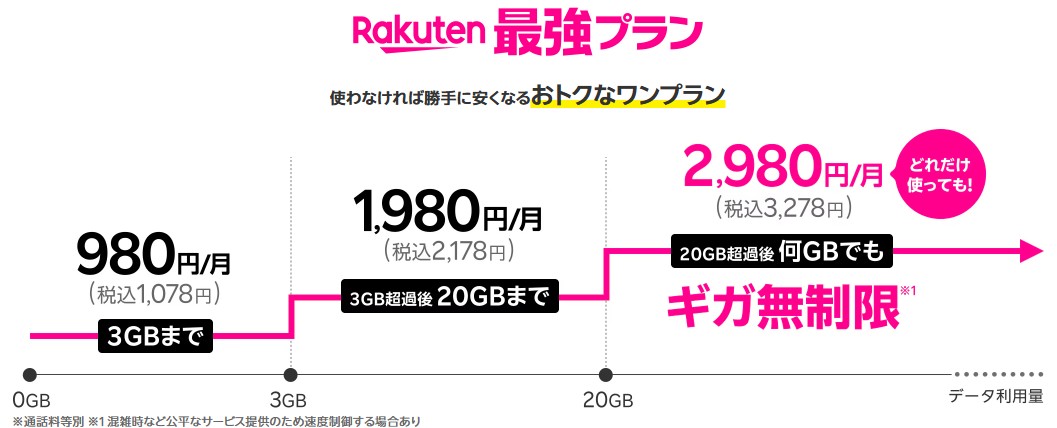 3GBまで月980円(税込1,078円)、3GB超過後20GBまで1,980円(税込2,178円)、20GB超過後無制限2,980円(税込3,278円)の3段階になります。※通話料等別