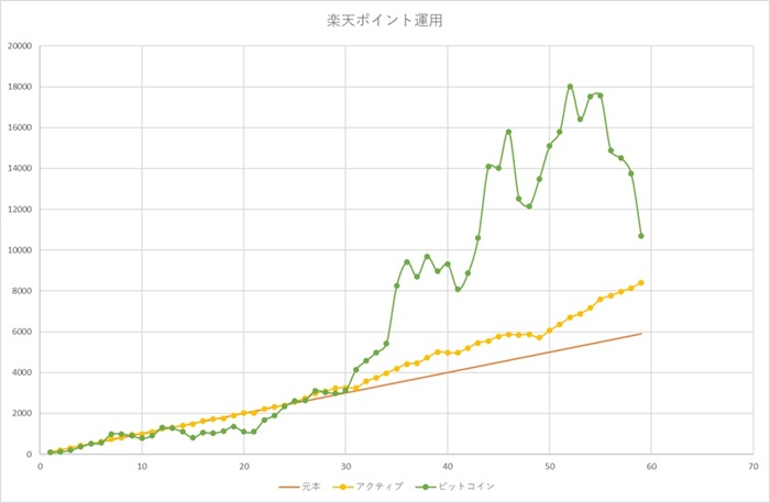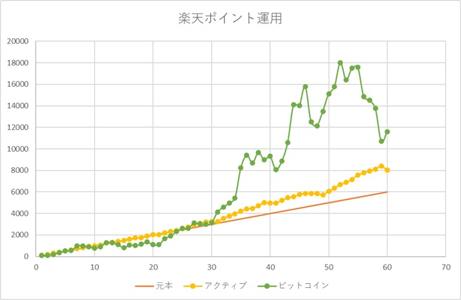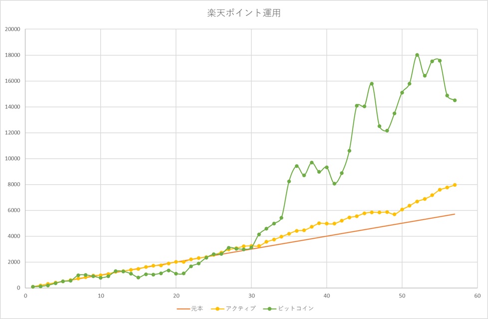 更に長期で運用するとどうなるのか、2年目以降のポイント運用(アクティビティ、ビットコイン)の実際の推移