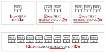 複数の店舗で買い物をすればその店舗数と同じ数のポイント還元率が増える買い回りポイントがあります。