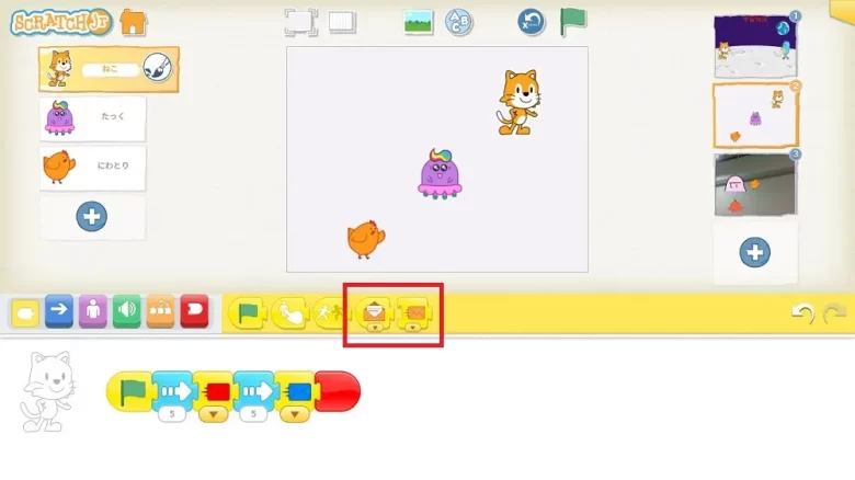 上は単純な例ですが、「きっかけブロックカテゴリー」のブロックを利用すると複雑なキャラクターの動きの展開も可能になります。