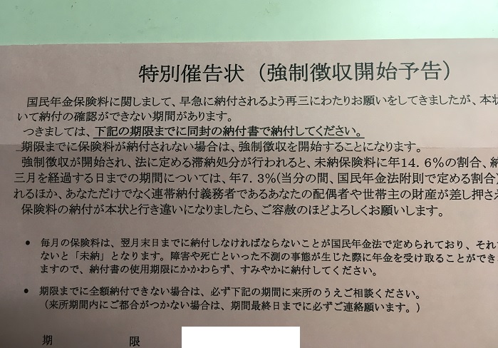日本年金機構から「特別催告状(強制徴収開始予告)」なるものが封書で届きました。