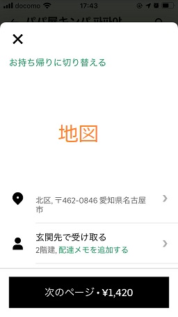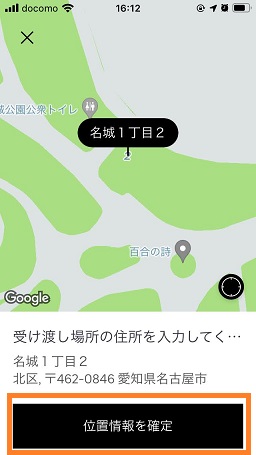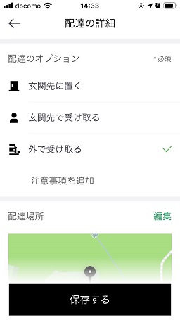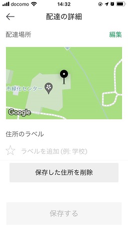配達場所のピンの位置の確認です。(ズレている場合は編集をタップしてマップを動かして修正できます)