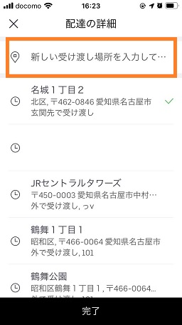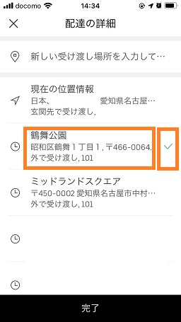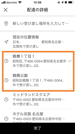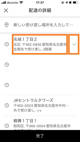 入力した住所とその住所の横にチェックが付いてるのを確認して「完了」をタップして登録完了です。