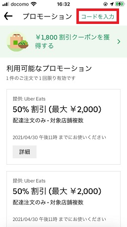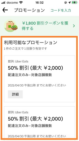 先ほどのプロモーションのページに現在保有しているクーポンが反映、表示されます。