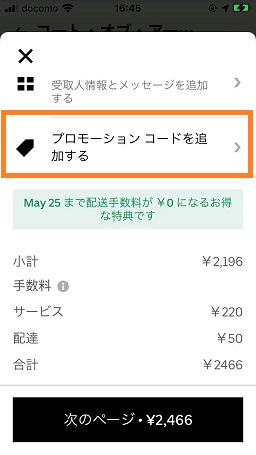 会計画面にてクーポンが適用されていない場合は、「プロモーションコードを追加する」をタップすると