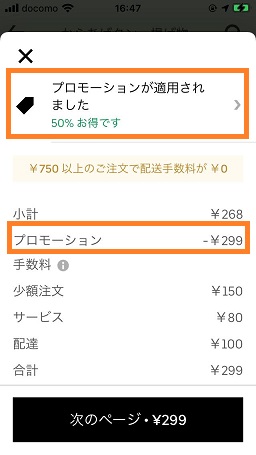Uber Eatsのクーポンの適用については基本的には自動で適用されていますが会計画面にて確認しましょう。