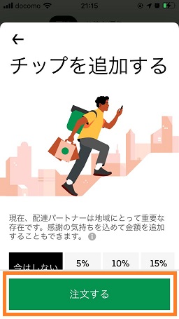 「次のページ」をタップして「注文する」をタップで注文が確定します。(配達パートナーへのチップは料理が届いた後に支払うことも出来ます)