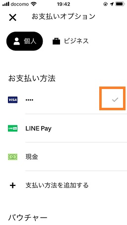 現在の支払い方法にチェックマークが付いてます、他の支払い方法に変更したい場合は他の支払い方法をタップします。