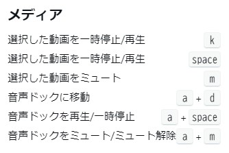 メディアは主に動画、音声に関するショートカットキーになります。